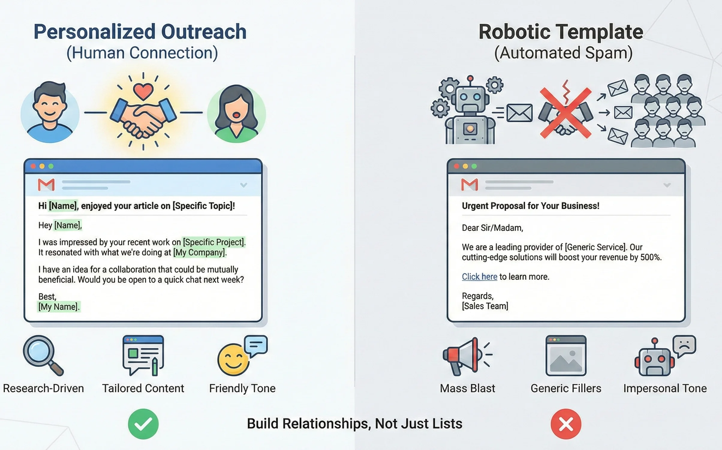 It’s a numbers game, but quality beats quantity. A personalized, value-focused email might have a 5-15% success rate. A generic, spammy blast will get you a 0% success rate and a blocked email.